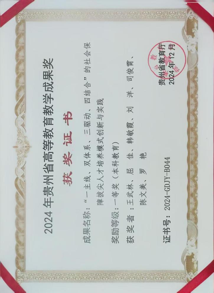 目前有专业教师14人,教授职称3人,副高以上职称10人。其中,拥有博士学位12人,教育部名师1人,省管专家1人,拥有博士生导师3人,硕士生导师9人。近五年来,本教研室教师承担国家社会科学基金课题、教育部人文社科等国家级课题6项,贵州省哲学社会科学规划重点课题、科技厅等省部级课题近20项,横向课题40余项;在CSSCI等各级各类期刊上发表论文30余篇,获贵州省哲学社会科学奖近10项,出版专著5部。获批国家一流课程1门,获贵州省教育教学成果一等奖1项,获教育部产学研“劳动与社会保障实践实训仿真教学平台建设”1项,获批2门省级“金课”,建成2门慕课,专业教师承担贵州省教育教学改革等各级各类改课题近10项。
