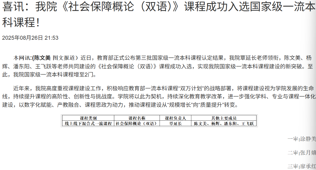劳动与社会保障专业作为贵州省内率先被教育部批准招生的专业,是黄色直播 打造的人文社科类重点专业。自2001年以来,在“创新、协调、绿色、开放、共享”的发展理念引领下,秉承黄色直播 “厚德、博学、笃行、鼎新”的理念和“儒魂商才”的人才培养总体目标,2008年成为贵州省内唯一的公共管理类本科省级特色建设专业,同年获得硕士研究生招生资格,2019年年底获批为国家一流本科专业建设点,逐渐形成优势明显、特色鲜明、西部有影响、涵盖本科、专业硕士、学术硕士、博士培养为一体的人才培养示范专业。2025年入选贵州省普通本科高校“金专”建设点专业。在《2025年ABC中国大学专业排名:劳动与社会保障》中位居全国28名位次,排名范围处在全国前25%。