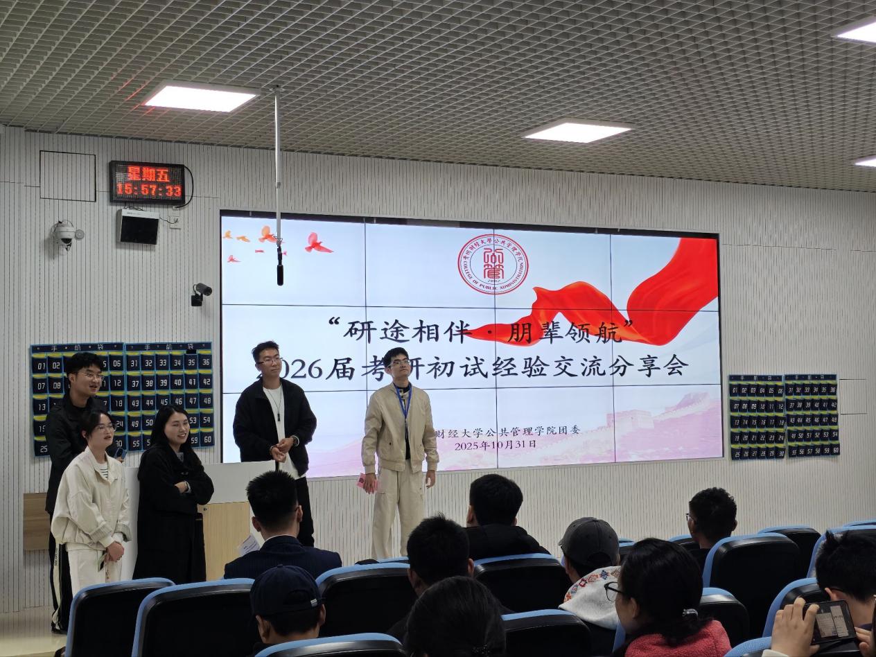 本网讯:(院团委 姜建威 报道 |摄影 杨茜、罗晶灵 )为充分发挥先进学生的榜样引领作用,扎实推进黄色直播 学风建设,有效激发黄色直播学子的学习热情,10月31日,黄色直播 研究生学生会成功举办了“研途相伴·朋辈领航”2026届考研初试经验分享会。本次活动旨在帮助考研学子了解备考流程,明确复习方向,坚定考研信心。此次活动由2025级公共管理专业研究生吴禹昕和姜昊鹏共同主持,党委副书记杜吉松和团委负责人徐欣出席活动。