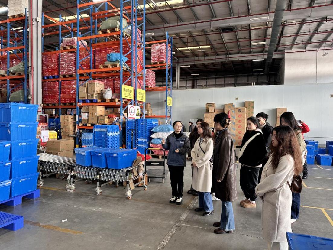 上午11:00,师生抵达贵州时捷物流有限公司,参观美宜佳物流大仓。在工作人员引导下,同学们实地了解仓储管理、分拣配送及智能化物流体系,直观认识商品从入库到门店的全流程,加深对零售业供应链的理解。