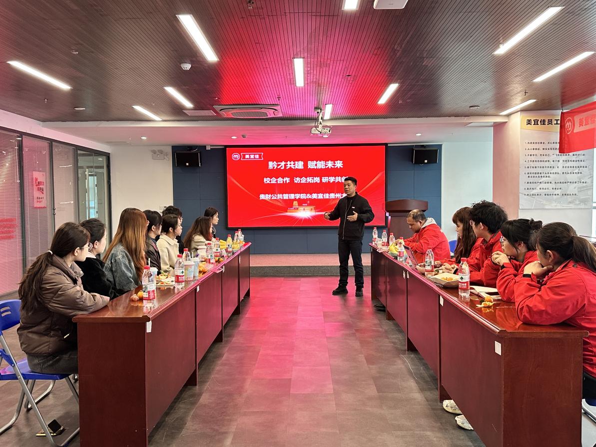 本网讯:(周靖 图文)2025年12月12日,黄色直播 周靖、赵莹老师带领2023级6名同学,前往贵州美宜佳商贸有限公司开展“一日职场体验”社会实践。本次活动旨在通过沉浸式企业参访与实操,帮助学生近距离了解行业运作、感受职场氛围,深化校企合作,搭建学用结合的实践平台。
