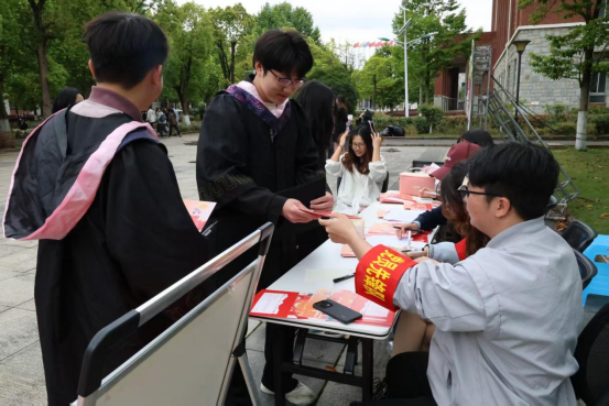活动现场,低年级学生党员组成志愿服务先锋队,在广场上悉心照看毕业生行李物品,帮大家拍照打卡出片,为学长学姐们提供暖心服务。
