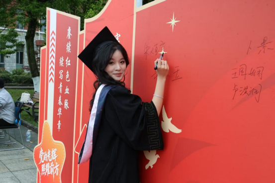 活动现场,一面印有“赓续红色血脉,续写青春华章”主题标语的红色签名墙成为最耀眼的打卡点。毕业生党员们身着学士服,郑重地在墙上签下自己的名字,与相伴四年的师长同窗合影留念,快门声中定格下一个个意气风发的瞬间。签名墙上,笔迹或刚劲或清秀,却都饱含着对校园时光的深深眷恋与对未来的无限憧憬。