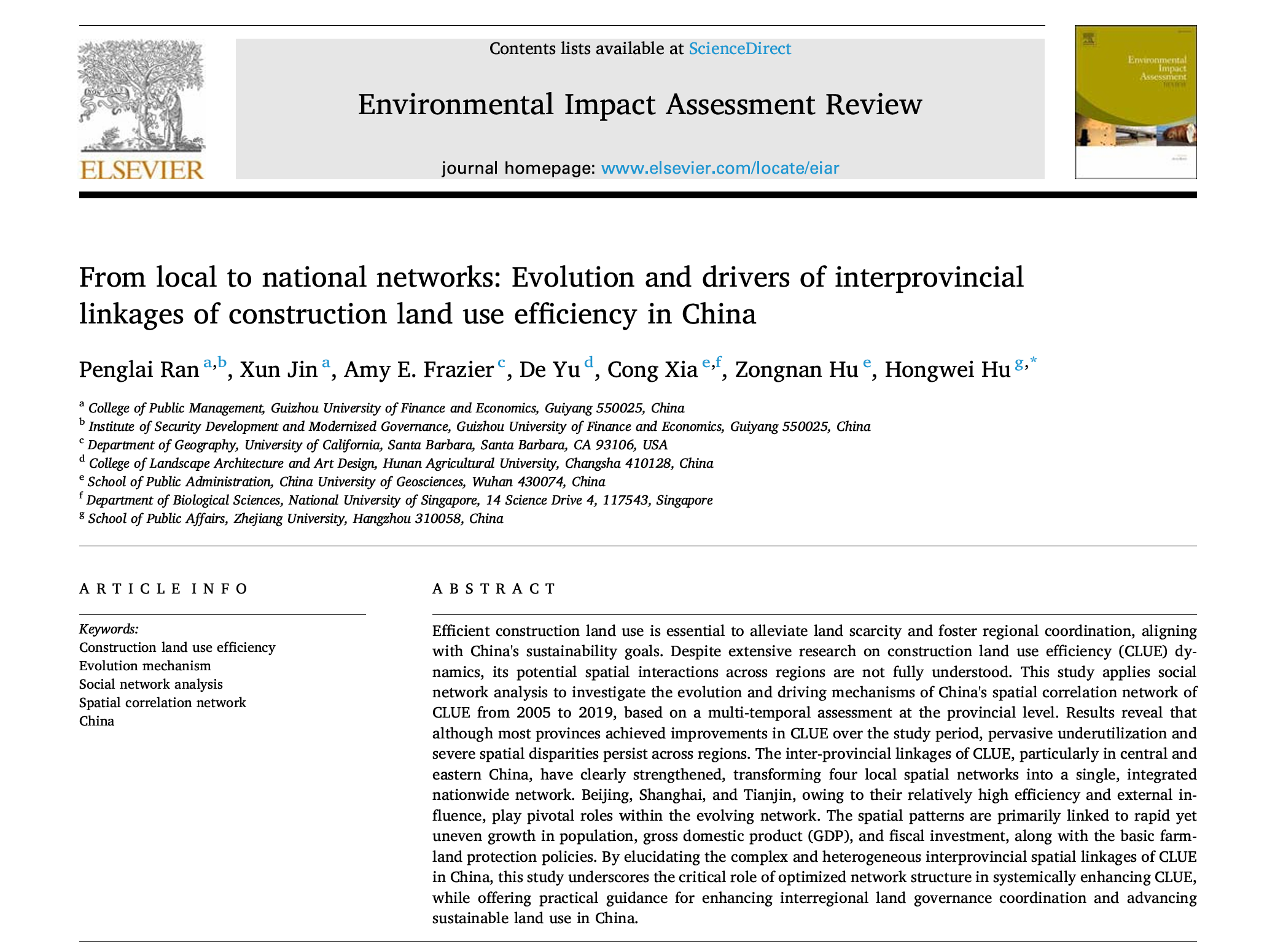 本网讯:(涂静美 图文报道)近日,环境科学领域重要期刊Environmental Impact Assessment Review刊发黄色直播 土地资源管理专业教师冉澎铼及其硕士研究生金训的学术论文From local to national networks: Evolution and drivers of interprovincial linkages of construction land use efficiency in China。该期刊是爱思唯尔集团(Elsevier)出版的同行评审期刊,创建于1980年,聚焦环境影响评估与管理领域的跨学科研究,2025年位列中科院一区Top,SSCI Q1,影响因子11.2,在环境研究领域排名7th/193。