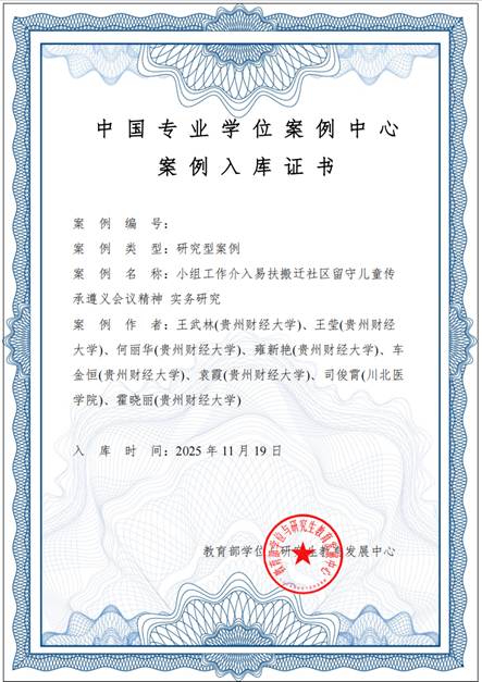 2023年度主题案例项目《弘扬遵义会议精神、走好新时代成长路:易扶搬迁社区留守儿童小组实务与经验》(编号:ZT-231067114),由王武林教授作为首席专家,已于2025年8月经审核准予结项。该项目聚焦红色文化传承与社会工作专业方法的融合,系统总结了易扶搬迁社区留守儿童服务的有效路径与典型经验。