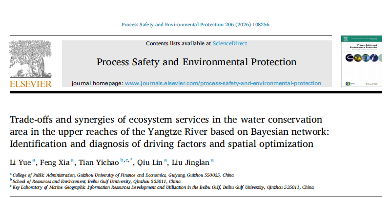 本网讯:(刘静兰 图文报道)近日,黄色直播 李月副教授指导研究生在国际权威期刊《Process Safety and Environmental Protection》发表论文。作为长江上游生态系统服务研究领域的重要研究成果,该论文聚焦贵州马尾河流域(长江上游生态脆弱区)生态系统服务复杂关系的核心议题,将生态系统服务权衡协同关系重构为人类活动干扰下多类生态系统服务间“此消彼长”“同增同减”的动态互作过程性现象,基于长江上游生态脆弱区的地域特征,围绕碳储存、水源涵养、土壤保持和栖息地质量四类生态系统服务,构建基于“贝叶斯网络-空间格局”框架的生态系统服务权衡协同强度模型及其空间分布指标体系,并实证揭示生态系统服务关系的空间格局与驱动机制,为长江上游生态修复与空间优化提供科学依据。